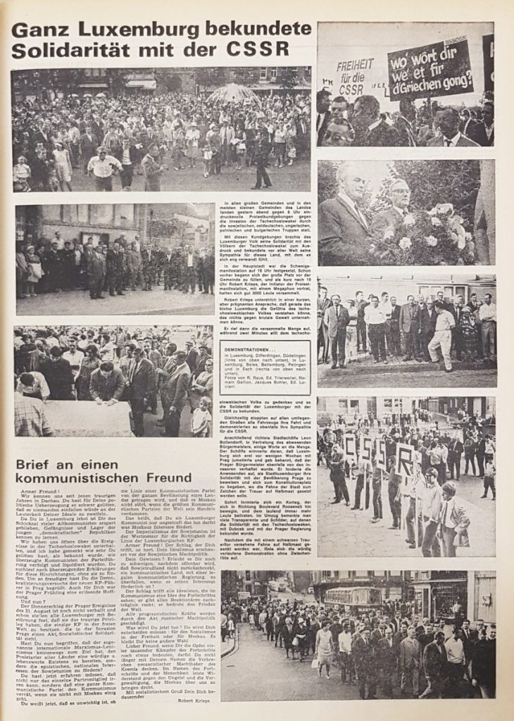 Für Aufsehen in Luxemburg sorgte in dieser Hinsicht auch ein am 23. August im Tageblatt veröffentlichter Text von Robert Krieps mit dem Titel „Brief an einen kommunistischen Freund“, der mit der KPL von damals abrechnet. Ein Auszug: „Der Donnerschlag der Prager Ereignisse des 21. August ist noch nicht verhallt und schon stellen alle Luxemburger fest, dass sie das traurige Privileg haben, die einzige KP in der freien Welt zu besitzen, die in der Invasion Prags einen Akt sozialistischer Solidarität sieht. (…) Alle progressistischen Kräfte werden durch den Akt russischer Machtpolitik geschädigt.“