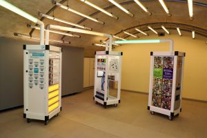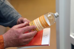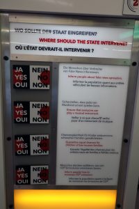 An der Station, die wie ein Getränkeautomat funktioniert, geht es um das Thema Sicherheit contra Privatsphäre. „Der Geheimdienst analysiert ohne Genehmigung E-Mail-Inhalte“, steht auf einer der Flaschen, die im Ausgabefach des Automaten liegen. „Einverstanden oder nicht?“, heißt die Frage dazu. In den Rückgabeschacht kommen die Flaschen, gegen deren Aufschrift nichts einzuwenden ist.