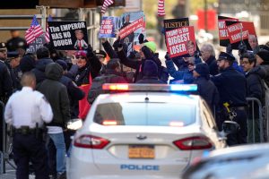 25.03.2024, USA, New York: Demonstranten protestieren vor dem Strafgericht in Manhattan, während sie auf die Ankunft des ehemaligen US-Präsidenten Trump warten. Ein Richter soll entscheiden, wann dem ehemaligen US-Präsidenten der Prozess gemacht wird. Foto: Seth Wenig/AP +++ dpa-Bildfunk +++