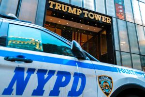 A New York City Police Department (NYPD) vehicle in front of Trump Tower on Fifth Avenue after former US President Donald Trump departed the building for his court hearing at Manhattan Criminal Court in New York City on March 25, 2024. Donald Trump faces twin legal crises today in New York, where he could see the possible seizure of his storied properties over a massive fine as he separately fights to delay a criminal trial even further. (Photo by Charly TRIBALLEAU / AFP)