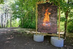 An den Anfangs- und Endpunkten der Freilichtausstellung spannte Lynn Theisen großformatige Fotos auf. Dort hielt sie die Arbeiten von zehn Künstlern fest, Installationen, die für die Dauer des Fotoshootings in dieser Minett-Umgebung realisiert worden waren.