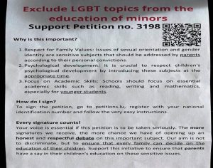 Auf dem Flyer steht: „Je mehr Unterschriften, desto größer ist die Chance, dass wir eine ehrliche und respektvolle Debatte über dieses wichtige Thema führen können.“ Die Petition 3198 gegen LGBTQ+-Themen in den Schulen liefert sich momentan ein Kopf-an-Kopf-Rennen mit der Gegenpetition 3281, die sich für mehr Aufklärung in den Bildungsinfrastrukturen einsetzt. Letztere verzeichnete mit 10.077 Unterschriften (Stand Donnerstagmittag) etwa 240 mehr – und kann noch 22 Tage unterschrieben werden. Bei der Petition, die sich für den „Ausschluss von LGBT-Themen aus der Erziehung von Minderjährigen“ einsetzt, sind es noch neun Tage.