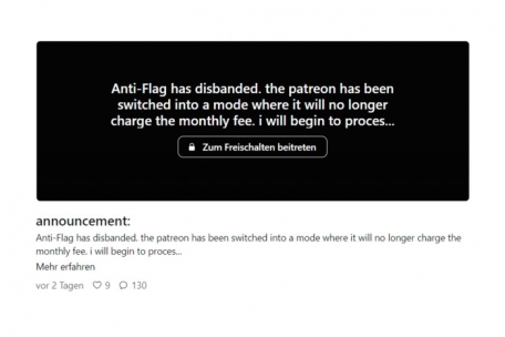Am 20. Juli erscheint dann folgende Mitteilung auf der Patreon-Seite der Band: „Anti-Flag haben sich aufgelöst. Der Patreon-Kanal wurde in einen Modus umgestellt, in dem er keine monatliche Gebühr mehr einzieht. In den kommenden Wochen wird euer Geld zurückerstattet und auch diese Seite wird offline gehen.“ Patreon ist eine Plattform, auf der Personen Künstler anhand monatlicher Geldbeiträge unterstützen können. Ein Mitglied der Crew von Anti-Flag bestätigt auf Instagram, dass die Gruppe aufhört, könne aber nichts Weiteres zu diesem Thema sagen.