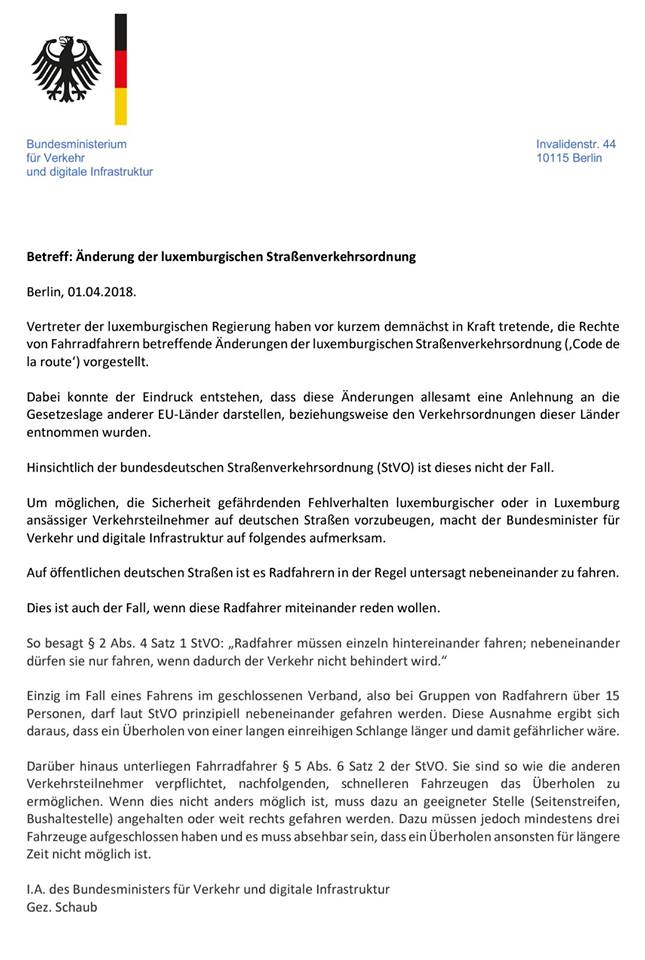Das scheint einigen Verantwortlichen im deutschen Bundesministerium für Verkehr und digitale Infrastruktur (BMVI) Sorgen bereitet zu haben. Wird der deutsche Straßenverkehr demnächst durch Fahrradkolonnen aus Luxemburg zum Kollaps gebracht werden? In einem offiziell aussehenden Schreiben, das derzeit im Internet kursiert und reichlich kommentiert wird, werden „luxemburgische oder in Luxemburg ansässige Verkehrsteilnehmer“ darauf hingewiesen, dass es in Deutschland untersagt sei, nebeneinander zu fahren: „Auch, wenn diese Radfahrer miteinander reden wollen.“
