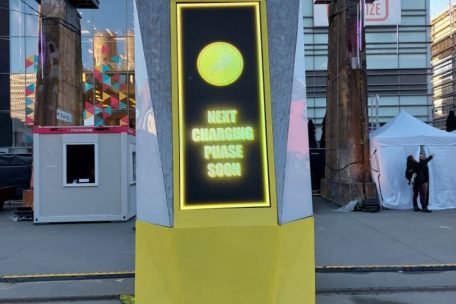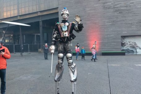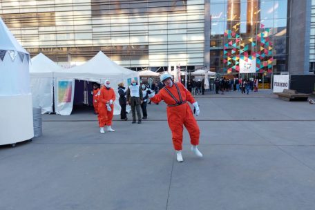 Der Bildschirm sei „für die Animation“ gedacht, sagt Yves. Ob die Aufgaben schwer sein werden, können die beiden Helfer jedoch nicht genau sagen. Denn sie wissen nur, was in ihrem eigenen Bereich ablaufen wird. Sie erzählen, dass die Besucher sich über das ihr Handy verbinden können, dafür bräuchten sie den Code an ihrem Armband. „Je mehr Menschen mitmachen, desto mehr werden die Batterien der Rakete aufgeladen“, erklärt Bianca. Jedes „Department“ hätte auch seinen eigenen Tanz, fügt sie hinzu. „Es soll alles interaktiv sein“, betont Yves.