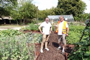 Dazu gehört auch ein Obstgarten mit noch existierenden alten Bäumen – einige mussten aufgrund ihres Zustands neuen weichen – und dem Anpflanzen von Spalierobst entlang der Gesamtlänge der Außenmauer des Gartens. Hier soll auf mehr als nur die gängigen Kräuter- und Gemüsearten zurückgegriffen werden. Verbraucht werden soll das, was hier gezüchtet wird, unter anderem in den „Maisons relais“ der Gemeinde, wie uns Bürgermeister Jungen erklärte.