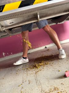 Bevor der Most ins Fass konnte, musste zunächst die Traubenpresse gereinigt werden. Aus 2.601 Kilogramm Trauben waren 1.800 Liter Most geworden – weit mehr, als wir uns je erträumt hatten, auch wenn wir zu Beginn des Projekts nicht wirklich wussten, was uns erwarten würde. Nun hieß es also putzen. Zuerst wurden die klebrigen Rückstände per Hand entfernt, dann mit Schlauch und Bürste die Kerne ausgespült. Es sollte nicht das letzte Mal an diesem Vormittag sein, dass ich nass wurde.