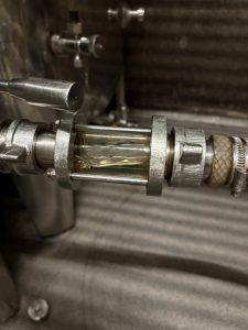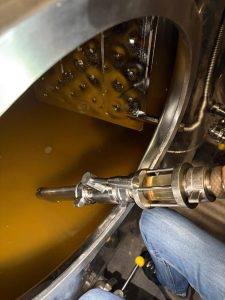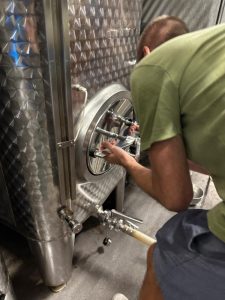 Wenige Tage nach dem Abfüllen blubbert es bereits kräftig aus unserem Edelstahlfass – die Gärung hat eingesetzt. Da die verwendete Hefe kühlere Temperaturen bevorzugt, läuft der Prozess etwas langsamer. Marc, der Kellermeister der Domaine Kox, zapft ein Glas ab: Der Geschmack ist noch recht süß, hat aber schon nichts mehr mit dem Most zu tun, den wir vier Tage zuvor probiert haben.