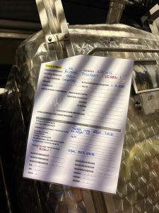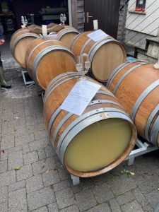 „Die Hefe braucht zusätzliche Nahrung“, erklärt Marc. Er rieche das sofort beim Betreten des Kellers. Erst als er uns darauf aufmerksam macht, nehmen auch wir den leicht schwefeligen Geruch wahr, der an faule Eier erinnert. Marc gibt Stickstoff hinzu, der der Hefe als Nahrung dient. Würde er das nicht tun, könnte die Gärung stocken und die schwefeligen Aromen blieben im Wein. Wie er später, wenn alle Fässer gefüllt sind, herausfindet, aus welchem Fass dieser Geruch stammt, bleibt wohl ein Geheimnis der Weinmachkunst.