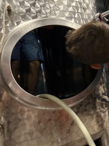 Nachdem die Hefe angerührt ist, muss sie noch mit Nährstoffen gefüttert werden. Währenddessen lerne ich ein Edelstahlfass von innen kennen. Denn bevor der Most hineindarf, muss es gespült und von Weinsteinresten befreit werden. Corinne zeigt mir die Technik, um durch die kleine Öffnung ins große Fass zu steigen. Nach gut 20 Sekunden bin ich drin und bekomme wieder einen Schlauch gereicht, um das Fass auszuspülen. „Vergiss die Decke nicht“, mahnt Corinne. Kaum trocken, stelle ich fest: Meine Sneakers sind alles andere als wasserfest.