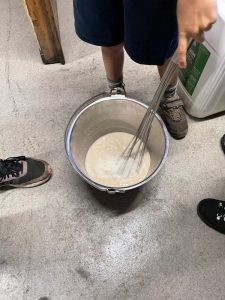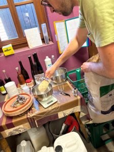 Nach Abnahme durch Corinne Kox folgte die nächste Aufgabe. „Jetzt bereiten wir schon einmal die Hefe vor“, erklärte die Winzerin. Unsere Redaktion hatte sich bekanntlich für einen trockenen, frischen und fruchtbetonten Rivaner entschieden. Dafür ist die richtige Hefe entscheidend: Sie verwandelt den Zucker während der Gärung in Alkohol.