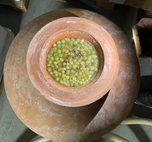 Von den insgesamt 1.800 Litern Most füllen wir 1.500 Liter ins Edelstahlfass. Da der Jahrgang üppig ausgefallen ist, bleibt noch Spielraum zum Experimentieren. Rund 200 Liter kommen in ein Holzfass – hier setzen wir eine andere, von der Domaine Kox selbst gezüchtete Hefe ein. Die lange Diskussion, ob wir unseren Rivaner überhaupt ins Holzfass legen sollen, erweist sich so im Nachhinein als überflüssig. Die restlichen gut 70 Liter füllen wir in ein Dolium – ein Tongefäß, wie es schon die Römer für Wein nutzten.