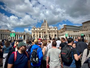 Als um 18.08 Uhr weißer Rauch aus dem Schornstein der Sixtina aufstieg, ging ein Raunen durch Rom – ein kollektives Innehalten, dann brach das Chaos aus. Die Massen rannten los. Ziel: Petersplatz. Im Nu war der Platz voll, kein Durchkommen mehr. Auch in den umliegenden Straßen stauten sich die Menschenmengen. Grund waren die Sicherheitskontrollen – so streng wie nie, hieß es.