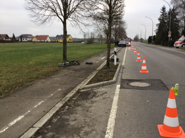 Ein schwerer Unfall hat sich am Samstagmorgen bei Hellingen ereignet. Ein Autofahrer ist bei einem Überholvorgang auf der N13 frontal mit einem entgegenkommenden Fahrradfahrer kollidiert. Der Radler ist laut Polizei schwer verletzt.