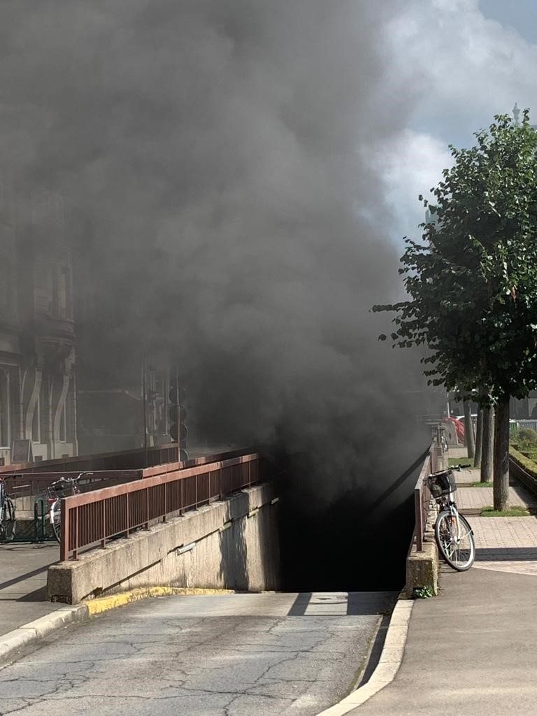 Ein strahlend blauer Himmel über der Hauptstadt, die Blätter der Bäume entlang dem „Rousegäertchen“ wippen leicht im Wind und plötzlich dringen dichte graue Rauchschwaden aus der Einfahrt der Tiefgarage. Ein brennendes Auto im ersten Untergeschoss der Tiefgarage sorgte am Montagmorgen für einen Großeinsatz der Feuerwehr.