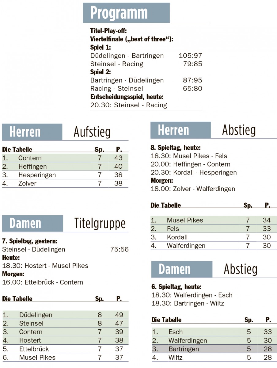 Während der T71 Düdelingen am Mittwoch nach einer beeindruckenden Aufholjagd den Halbfinaleinzug frühzeitig klar machte, kämpfen Steinsel und der Racing heute Abend (Samstag, 30.3.) im entscheidenden dritten Spiel der Viertelfinalserie um den letzten Halbfinalplatz.