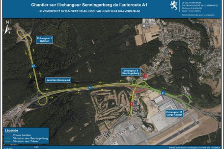 Der Verkehr von der Autobahn A1 in Richtung Anschlussstelle Senningerberg wird ab der Anschlussstelle Senningerberg über die A1 in Richtung Trier, die Anschlussstelle Cargo-Center, die A1 in Richtung Luxemburg und die Anschlussstelle Senningerberg umgeleitet.