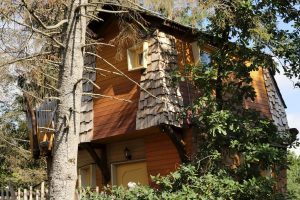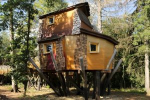 Zusätzlich zum Café stehen insgesamt drei fantasievoll gestaltete, zweistöckige Unterkünfte zur Verfügung. Ende Oktober sollen diese Baumhäuser die ersten Gäste empfangen. Ein Haus ist rollstuhlgerecht eingerichtet. Zwei der Baumhäuser können maximal sechs Gäste aufnehmen, das dritte bietet Platz für vier Personen. Jedes Haus verfügt über ein eigenes Bad mit Dusche und einen Kühlschrank. Auch Besteck und Gläser sind vorhanden. Kochen und Grillen sei aus Sicherheitsgründen aber untersagt, betont Anne Meyers. Zudem wurden die Holzhäuser passend zum Tierpark thematisch gestaltet. Eines gehört „Maisy aus dem Kuelebierg“, die sich gut mit Vögeln versteht, in einem anderen wohnt die italienischstämmige Mia Morilla, die sich mit Pilzen auskennt, und in einem dritten haust Dr. Dax, ein Veterinär in Rente, der die Sprache der Tiere versteht.