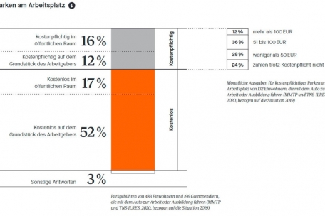Gleichzeitig können laut Analyse 52 Prozent der Arbeitnehmer, die mit dem Auto zur Arbeit fahren, kostenlos auf dem Grundstück ihres Arbeitgebers parken. Weitere 17 Prozent parken umsonst im öffentlichen Raum. Das Pendeln mit dem Auto werde also von den Arbeitgebern und der öffentlichen Hand finanziell gefördert. Zwischen 370.000 und 420.000 Parkplätze sind in Luxemburg wochentags von Arbeitnehmern zu Hause oder am Arbeitsplatz belegt. Die restlichen rund 500.000 standen also selbst an Wochentagen anderen Zwecken als dem Pendeln zwischen Wohnort und Arbeitsplatz zur Verfügung.