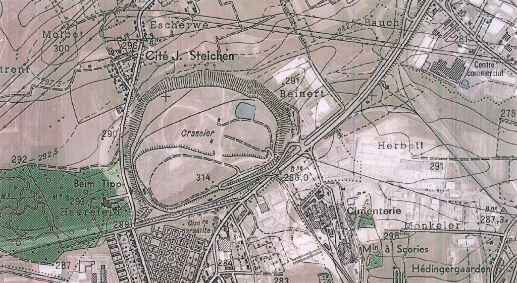 Erst 1907 ist auf ebendiesen Karten von „Crassier“ die Rede, 1939 ist das Gebiet sogar als solches eingezeichnet. Die Schlacke der umliegenden Hochöfen musste irgendwohin, das brachliegende Gelände bot sich an. Bis 1979 ist der „Plateweier“ noch eingezeichnet. Spätestens ab 1994 lagert der Besitzer des Geländes, damals die Arbed, dort Schlacke ab. In dem Jahr gibt das damalige „ministère du Travail et de l’Emploi“ das Gelände dafür frei.
