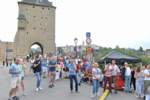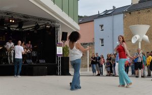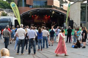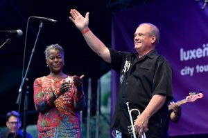 Nach dem Abstieg über die montée de la Pétrusse erblicke ich zuerst ein stilvoll platziertes Werbebanner von Volkswagen, die den inhaltlichen Bezug zur Rallye vermutlich durch ihre BlueMotion-Technologie herstellen wollen. Gleich danach kommt die „In the Mood Stage“ am „Parking St. Ulric“, wo die Big Band Spectrum in bester Stadtfestmanier ein schmissiges Cover von „Street Life“ zum Besten gibt. „Ist das jetzt Blues oder Jazz?“, erkundigt sich eine junge Frau bei ihrer männlichen Begleitung. Der Herr holt hastig den Flyer der Veranstaltung aus der Hosentasche und beäugt kritisch das Line-up, das ein weiser Geist vorsorglich nach Farben den zwei Genres zugeordnet hat, um etwaige Unsicherheiten beim Zuhörer zu unterbinden. „Jazz!“, lautet sein erleichterter Ausruf. Der Abend ist gerettet. Ich entschließe mich weiterzugehen.