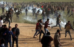 Blutige Bilanz beim „Marsch der Rückkehr“ im Gazastreifen: Bei Zusammenstößen mit der israelischen Armee sind am Freitag mindestens zwölf Palästinenser getötet worden, einer von ihnen schon vor Beginn der Proteste am frühen Morgen. Rund 1.100 Demonstranten wurden an der Grenze zu Israel verletzt, wie das Gesundheitsministerium in Gaza mitteilte. Die meisten wurden durch Tränengas verletzt.