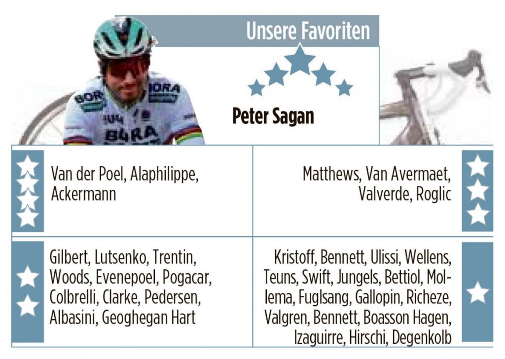 Matthieu van der Poel, Julian Alaphilippe und Peter Sagan: Das sind die drei Namen, die am häufigsten genannt werden, wenn man in Fachkreisen nach dem neuen Straßen-Weltmeister der Männer fragt, der am morgigen Sonntag in der ehemaligen Grafschaft Yorkshire im Norden Englands gekürt wird. Diese Prognosen sind keineswegs gewagt, denn auf dem hügeligen Terrain, das der ersten Tour-de-France-Etappe aus dem Jahr 2014 (Sieger Marcel Kittel vor Peter Sagan) zum Teil sehr stark gleicht, kann es kaum einen Zufallssieger à la Heinz Müller (Luxemburg 1952) oder Harm Ottenbros (1969 Zolder) geben. Dafür scheinen die Bedingungen nicht erfüllt.