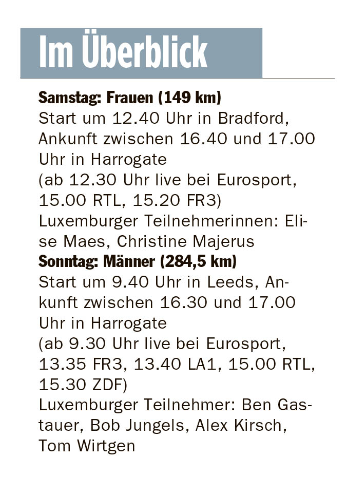 Christine Majerus und Bob Jungels sind die Luxemburger Aushängeschilder bei den Straßen-Weltmeisterschaften der Elite, die heute und morgen im englischen Yorkshire ausgetragen werden. Favoriten gibt es zuhauf, sowohl bei den Frauen als auch bei den Männern.