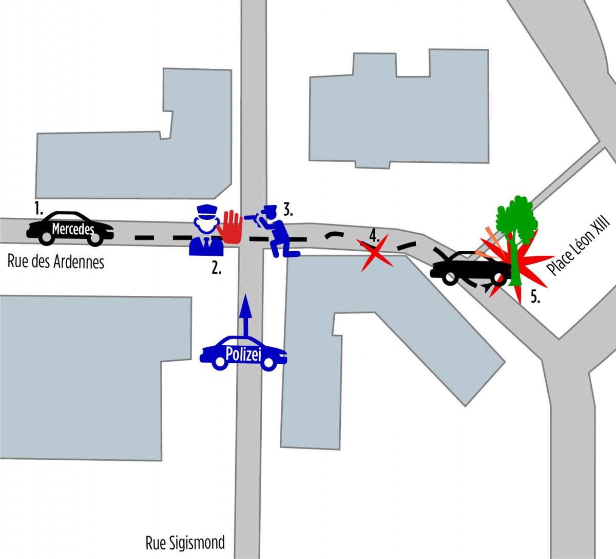 In Höhe der Kreuzung rue des Ardennes und rue des Sigismond habe ein Polizeibeamte dann versucht, den schwarzen Mercedes zu stoppen. Der Fahrer habe zunächst gehalten, sei dann rückwärts gefahren und habe auf den Polizeibeamten zugehalten und versucht, ihn zu überfahren. Letzterer habe daraufhin von seiner Schusswaffe Gebrauch gemacht. Einer der Schüsse traf dabei den Fahrer.