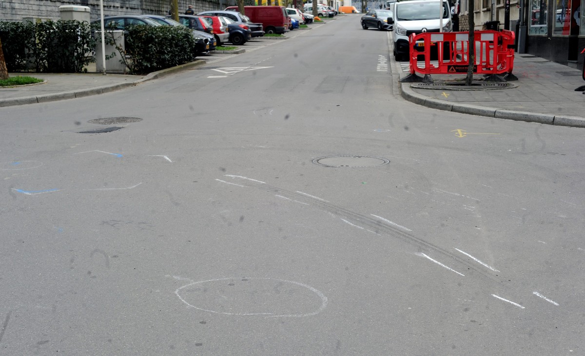 „Da sieht man die Bremsspuren. Der schwarze Mercedes kam von oben und fuhr die Straße entlang“, erklärt Americo und deutet mit dem Arm in Richtung place Léon XIII. Americo und sein Arbeitskollege Marcelo waren am Mittwoch gerade dabei, Arbeiten in einer Baugrube am Bürgersteig an der Kreuzung rue des Ardennes und rue Sigismond durchzuführen, als es zu dem folgenschweren Vorfall kam.