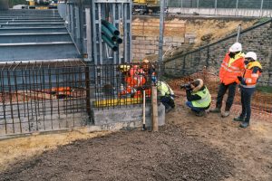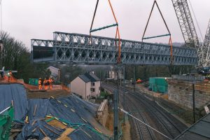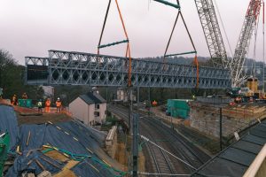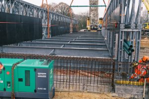 Es war ein sehr imposantes Bild, wie die 150 Tonnen schwere Behelfsbrücke in luftiger Höhe über den bestehenden Übergang gedreht und in ihre Endposition gebracht wurde. In nur 90 Minuten setzte der Stahlkoloss beidseitig problemlos auf den Auflegern auf. „Dank des nur leichten Windes ging das problemlos und schnell über die Bühne“, so ein Mitarbeiter der Kranverleih-Firma ATS. Anschließend wurden die Verankerungen angebracht und die Bodenplatten mit zwei Kränen auf die Brücke gehievt. Nach rund zwei Stunden konnten Arbeiter in aller Sicherheit die Brücke vom Kranhaken befreien.