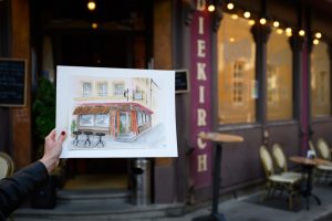 Schon als Kind liebte ich es, zu malen und entschied mich im „Lycée“ für die Kunstsektion. Doch seit meinem Studienanfang malte ich fast nicht mehr. Eines Samstagabends im Lockdown fragte ich mich, wo ich gerade gerne wäre, und begann, das Lokal „Vins Fins“ im Grund zu malen. So entstand meine Café-Serie, die ich „Places I Missed During Lockdown“ nannte. Wegen der Langeweile und der Isolation malte ich einfach darauf los, ohne viel darüber nachzudenken. Während der Zeit stellte ich auch meine Doktorarbeit in der amerikanischen Literatur fertig, da kam das Malen als willkommene Abwechslung. Es war mein Ausgleich in dieser merkwürdigen Phase.