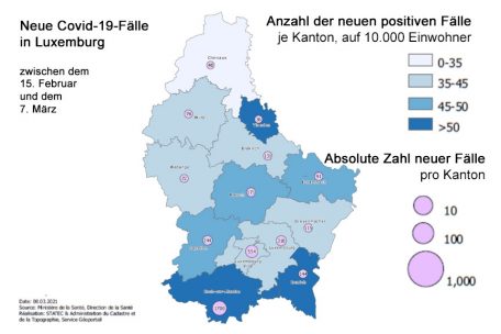 Im Kartenüberblick (der sich nicht auf den Lauf einer Woche, sondern auf die Zeit vom 15.2. bis zum 7.3. bezieht) ist außerdem zu erkennen, dass der nördlichste Kanton weniger betroffen ist, während im Süden die Kantone Esch und Remich besonders stark betroffen sind.