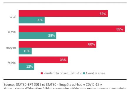 Ob überhaupt eine Möglichkeit zur Telearbeit angeboten oder wahrgenommen wurde, war 2019 nicht von Geschlecht oder Familiensituation abhängig – sondern mehr von Alter und Nationalität. Auch der Bildungsgrad spielte vor der Corona-Krise eine Rolle. „Vor Covid-19 war die Wahrscheinlichkeit, dass Arbeitnehmer mit einem Universitätsabschluss aus der Ferne arbeiteten, fast dreimal so hoch wie bei Arbeitnehmern mit einem niedrigeren Abschluss“, schreibt das Statec. Laut der Ad-hoc-Umfrage, die das Statistikamt während der Krise gemacht hat, war die Telearbeit auch dann vor allem bei Personen mit höherer Bildung häufiger anzutreffen – obwohl der Unterschied weniger ausgeprägt war.