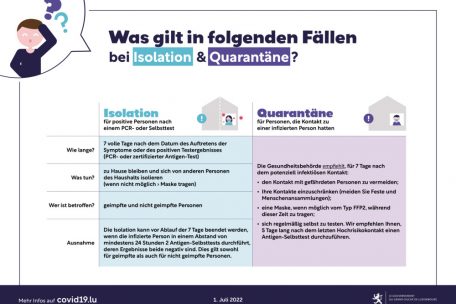 Auch nach zwei Jahren begleitet uns die Covid-Pandemie weiter. Doch wie schon in den vergangenen Jahren hat sich die Lage im Sommer merklich entspannt. Laut dem aktuellsten Covid-Bericht des Gesundheitsministeriums gab es in der Woche vom 29. August bis zum 4. September insgesamt 715 neue Covid-Fälle. Davon 298 Personen, die sich nach einer überstandenen Infektion ein weiteres Mal infiziert haben. 4.937 Tests wurden in besagter Woche durchgeführt. Am 4. September gab es 1.821 aktive Infektionen in Luxemburg. Insgesamt haben laut dem Santé-Bericht bisher 284.464 Menschen eine Covid-Infektion überstanden. Die Lage in den Krankenhäusern scheint in Bezug auf die Coronakrise entspannt zu sein: Am vergangenen Donnerstag befand sich niemand auf der Intensivstation und nur fünf Menschen in Luxemburg mussten wegen der Krankheit hospitalisiert werden.