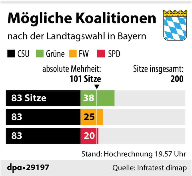 Seit 1962 hatte die CSU Bayern mit Ausnahme der Wahlperiode 2008 bis 2013 allein regiert. Eine komfortable Mehrheit hätte jetzt eine schwarz-grüne Koalition. Die Grünen-Spitzenkandidatin Katharina Schulze zeigte sich gesprächswillig: „Natürlich sind wir bereit, Verantwortung für dieses schöne Land zu übernehmen.“ Söder war jedoch skeptisch: „Inhaltlich sind die Grünen meilenweit entfernt.“ Er werde mit allen außer der AfD reden und strebe ein bürgerliches Bündnis an.