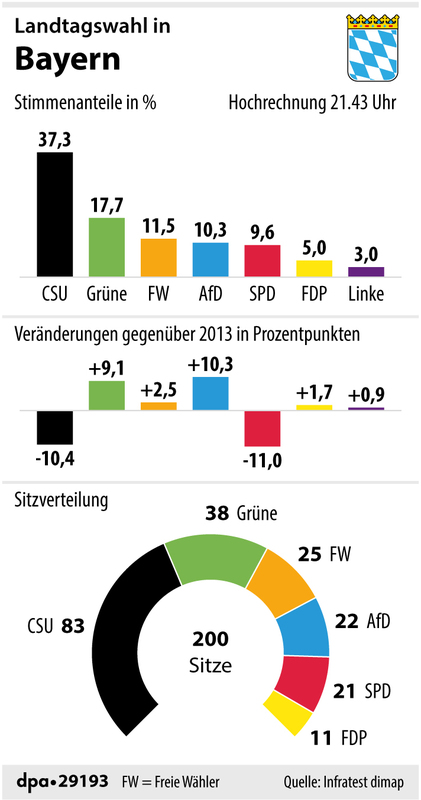 Daraus ergibt sich folgende Sitzverteilung: CSU 78 bis 83, SPD 20, Grüne 37 bis 38, Freie Wähler 25, AfD 22 bis 23 und FDP 10 bis 11. Die unterschiedlichen Sitzzahlen von ARD und ZDF sind auf das komplizierte bayerische Wahlrecht zurückzuführen. Die Wahlbeteiligung lag bei rund 72 Prozent (2013: 63,6).
