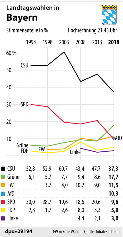 Nach den 21-Uhr-Hochrechnungen von ARD und ZDF kommt die CSU mit einem Minus von gut 10 Prozentpunkten nur noch auf 37,3 bis 37,4 Prozent – ihr schlechtestes Ergebnis seit 1950. Die SPD halbiert mit Verlusten von rund 11 Punkten ihr Ergebnis von 2013 und landet bei 9,4 bis 9,6 Prozent. Zweitstärkste Kraft werden die Grünen mit 17,8 Prozent – mehr als eine Verdoppelung gegenüber 2013. Es folgen die Freien Wähler mit 11,5 bis 11,8 Prozent, dicht dahinter die AfD mit 10,4 bis 10,6 Prozent. Die FDP stand am Abend mit 5,0 Prozent auf der Kippe. Die Linke scheitert mit 3,0 bis 3,2 Prozent.