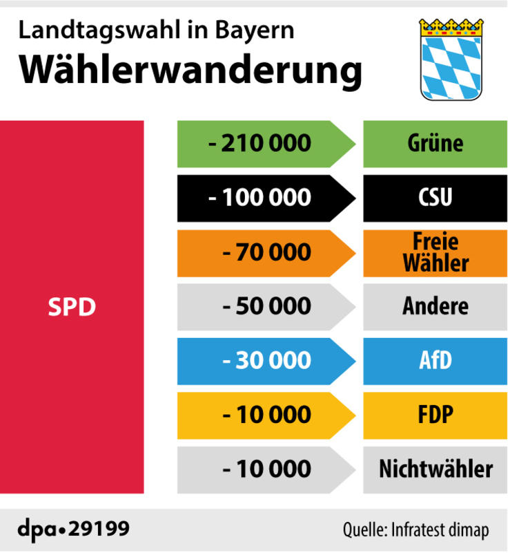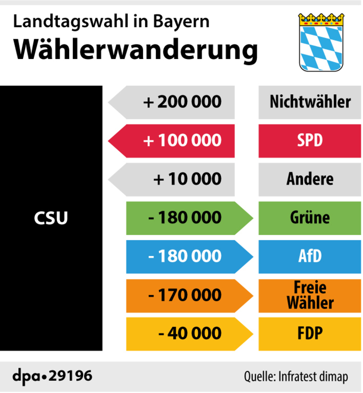 Nach einer Analyse der Forschungsgruppe Wahlen sind die Gründe für den Absturz der CSU aber „primär hausgemacht“. Diese zeige bei Regierungsbilanz, Parteiansehen und Sachkompetenzen Defizite und habe „ein erhebliches Personalproblem“: „Neben einem schwach bewerteten Ministerpräsidenten steht in Bayern ein massiv kritisierter Parteichef.“ Einer ARD-Analyse zufolge verlor die CSU jeweils 180 000 Wähler an Grüne und AfD sowie 170 000 an die Freien Wähler. Diesen Verlust dämpfte der Hinzugewinn von 200 000 bisherigen Nichtwählern.
