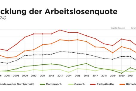 Was wenig überrascht, spiegeln die Statistiken doch auch die soziale Realität in der Stadt wider. Mit vielen Menschen, die ein geringes Ausbildungsniveau besitzen. Das ist auch der Grund, weshalb Esch ganz besonders stark von den unterschiedlichen Krisen getroffen wird. Nach der Finanzkrise von 2008 stieg die Arbeitslosenquote laut Statec hier deutlich stärker an als anderswo in Luxemburg. Nach 2015 ging die Quote dann aber auch wieder schneller zurück. Von den Folgen der Corona-Krise wurde Esch ebenfalls stärker getroffen als der Landesdurchschnitt. Und mit der aktuellen wirtschaftlichen Stagnation, die vor allem auf den Bausektor zurückzuführen ist, hat sich die Lage in der zweitgrößten Stadt des Landes nun wieder deutlich verschlechtert.