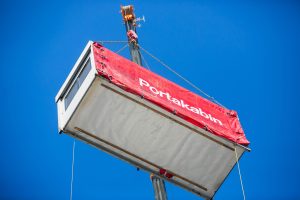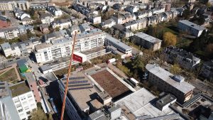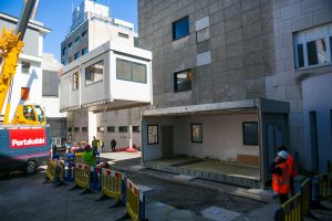 Die Krane sind aufgebaut, als die beiden Container am Mittwoch um kurz nach 11.00 Uhr beim CHEM eintreffen. Serge Meyer sieht zu, als sie vor dem Hintergrund eines babyblauen Himmels über die „Passerelle“ des Krankenhauses befördert werden. Der Gang zwischen den zwei Krankenhausgebäuden, in dem sich unter anderem das Büro des Krankenhausdirektors Hansjörg Reimer befindet, musste für die Dauer der Aktion evakuiert werden. Die 7,5 mal 3 Meter großen Container werden direkt an den Teil des Krankenhauses angebunden, in dem die Corona-Patienten untergebracht sind. Am 13. April soll der Scanner zum ersten Mal in den Einsatz – davor muss noch einiges erledigt werden.