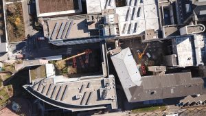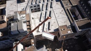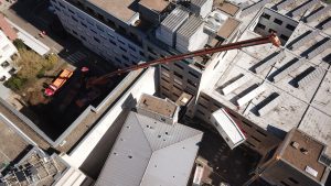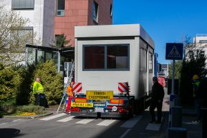 Pünktlich um 9.00 Uhr wartet ein Lastwagen vor dem Eingang des Krankenhauses in der Emile-Mayrisch-Straße. Auf seiner Ladefläche befindet sich ein 130 Tonnen schwerer Kran. Der Kran, der knapp zwei Stunden später zwei Container über einen Teil des Krankenhausgebäudes hieven wird. In ihrem Inneren kommt der Scanner unter, der dem Krankenhaus bei der Diagnose des Coronavirus helfen wird.