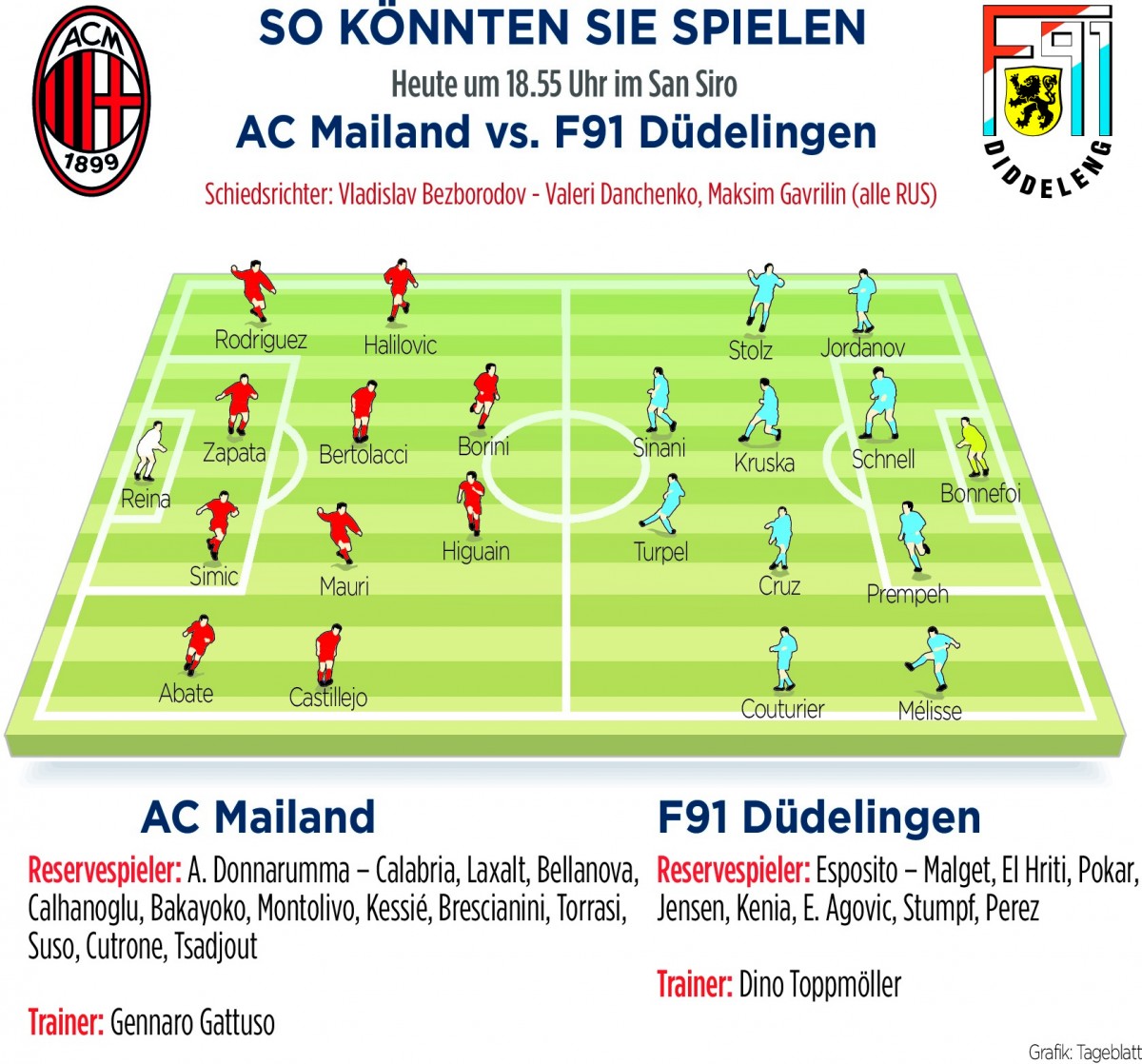 Beim Hinspiel gegen die Rossoneri war den Luxemburgern dieses Vorhaben über weite Strecken der Partie gelungen – Mailand entschied das Spiel nach einem abgefälschten Higuain-Schuss zu seinen Gunsten. Nachdem der Argentinier in der Liga eine Sperre absitzen musste, erwartet man ihn heute wieder in der Startelf von Gennaro Gattuso. Probleme hatte den Luxemburgern auch Castillejo über dessen rechte Seite bereitet.