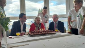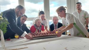 Und so kam Marie-Françoise, seit ihrer frühen Kindheit Mayou genannt, bereits in jungen Jahren mit der Musik in Kontakt. Die prägte ihr langes Leben bis heute. „Die Musik war immer meine Leidenschaft, vor allem Opern und Operetten“, sagte Marie-Françoise Delrez am Montagnachmittag bei ihrer Geburtstagsfeier im Schifflinger Pflegeheim. Dort hatte das Personal eine kleine, sympathische Feier mit einem riesigen Geburtstagskuchen organisiert. Das neue Mitglied im Club der 100-Jährigen blies die Kerzen aus eigener Kraft aus und erntete den Beifall der Gäste, darunter Familienminister Max Hahn (DP), Schifflingens Bürgermeister Paul Weimerskirch (CSV) und der erste Schöffe der Stadt, Carlo Feiereisen (LSAP).