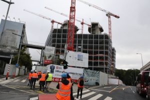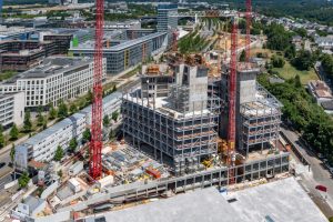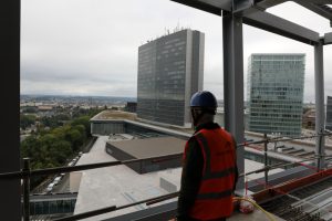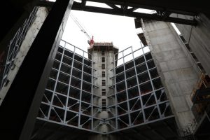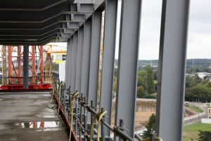 Heute ist es bereits über acht Stockwerke hoch, die Treppenhäuser reichen derzeit bis über das achte Stockwerk, während die Stahlkonstruktion und die Decken bis zum sechsten Stockwerk gebaut sind. Die Aussicht von hier ist grandios: In jeder Richtung kann der Blick bis weit über Luxemburg-Stadt hinwegschweifen. Es wird eines der höchsten Gebäude des Landes. 21 Stockwerke sind geplant.