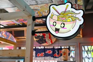 Viel Platz ist in dem Pavillon, der zuletzt während Esch2022 als Infopunkt genutzt wurde, nicht. Das macht die Einrichtung besonders. „Unser Restaurant ist ganz im Stil des japanischen Streetfoods gehalten, auch Festival-Stil genannt“, erklärt Johnny Ye. An den Wänden hängen Leuchtreklamen mit Nudel essenden Katzen und an der Decke Mangas. Alles ist bunt und leuchtet, so wie die Japaner das mögen. „Hier in Esch ist alles auf Jugend getrimmt, während die Deko in der Stadt ein wenig zurückhaltender ist“, erklärt Ye. In der Mitte des Raumes steht eine Holzkonstruktion, die die vier Vierertische des Restaurants voneinander trennt. Außerdem gibt es fünf Zweiertische und drei Einzelplätze. Spätestens im nächsten Sommer soll eine Terrasse hinzukommen. Dort, wo momentan die „Vëlotaxis“ abfahren, soll es dann den ganzen Tag lang Snacks und Getränke geben. Dafür muss aber auch der ArcelorMittal-Stahlträger weg, der für Esch2022 zu Werbezwecken aufgestellt wurde und noch immer dort steht.