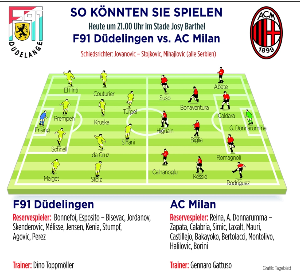 Und das ist auch einer der Gründe, warum der Traditionsverein Düdelingen nicht auf die leichte Schulter nimmt. „Sie haben sich ihre Teilnahme an der Europa-League-Gruppenphaset. Düdelingen ist für mich keine Überraschung. Uns erwartet ein sehr schweres Spiel. Ein Verein wie Milan hat in einem solchen Duell alles zu verlieren“, warnte Trainer Gennaro Gattuso schon mal vor.