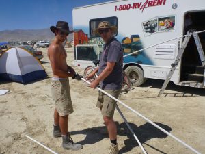 Eine Woche lang verbrachte das Trio im Camper in der Wüste, tauschte Peanut Butter oder Ravioli aus der Dose gegen andere Lebensmittel und rechnete, wie viel Wasser es beim Klogang verbrauchen durfte, damit noch genug zum Spülen bleibt. „Wenn man den ,Burning Man‘ zusammen erlebt, verbindet das einen fürs Leben“, meint Milli. Mit gekauften Fahrrädern und jeder Menge Utensilien aus dem Baumarkt erkundeten die Burner – so nennen sich die Event-Besucher – die Metropolis in der Wüste, fuhren mit den geschmückten „Art Cars“ herum, machten Bekanntschaften. „Eine der skurrilsten Geschichten ist die von unserem Camp-Nachbarn Johann, der anderen Leuten per Autobatterie und Kabel das Logo des Man einbrannte“, erinnert sich Ryck.