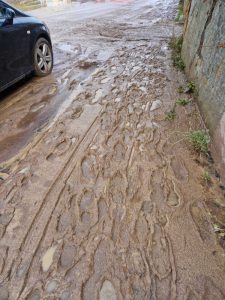 Wenige Straßen weiter liegen die Nerven blanker. Ein Einwohner gestikuliert heftig im Streit mit einem Gemeindearbeiter, der mit dem Bagger versucht, den Schlamm aus der Straße zu entfernen. An der hinteren Mauer ist deutlich zu sehen, dass das Wasser hier zumindest hüfthoch stand – und viel Dreck hinterlassen hat. „Bis vor anderthalb Stunden waren wir noch eingesperrt“, erzählt uns Xenia (23). Die junge Frau lebt im gleichen Apartmentgebäude und ist ebenfalls dabei, Schlamm zu schaufeln. „Hinter unserem Gebäude läuft ein kleiner Bach – der ist über die Ufer getreten und hat alles hier reingeschwemmt. Da unsere Haustür ebenerdig liegt und das Wasser so hoch war, konnten wir nicht raus.“