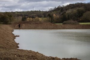 Echternacher See, Bagger durchbricht die Lehmschicht über der Folie und der See ist ausgelaufen.